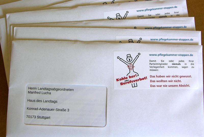 Die Sozialminister in Baden-Württemberg und Nordrhein-Westfalen haben Post von pflegekammer-stoppen.de bekommen.